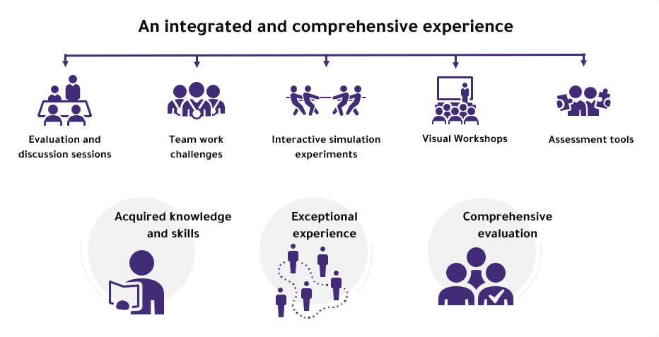 A qualitative and integrated experience that achieves clear results and outputs in terms of developing one-team skills through assessment tools, visual models and simulation experiments, as well as teamwork games based on scientific foundations and concepts that combine strategic and managerial expertise.